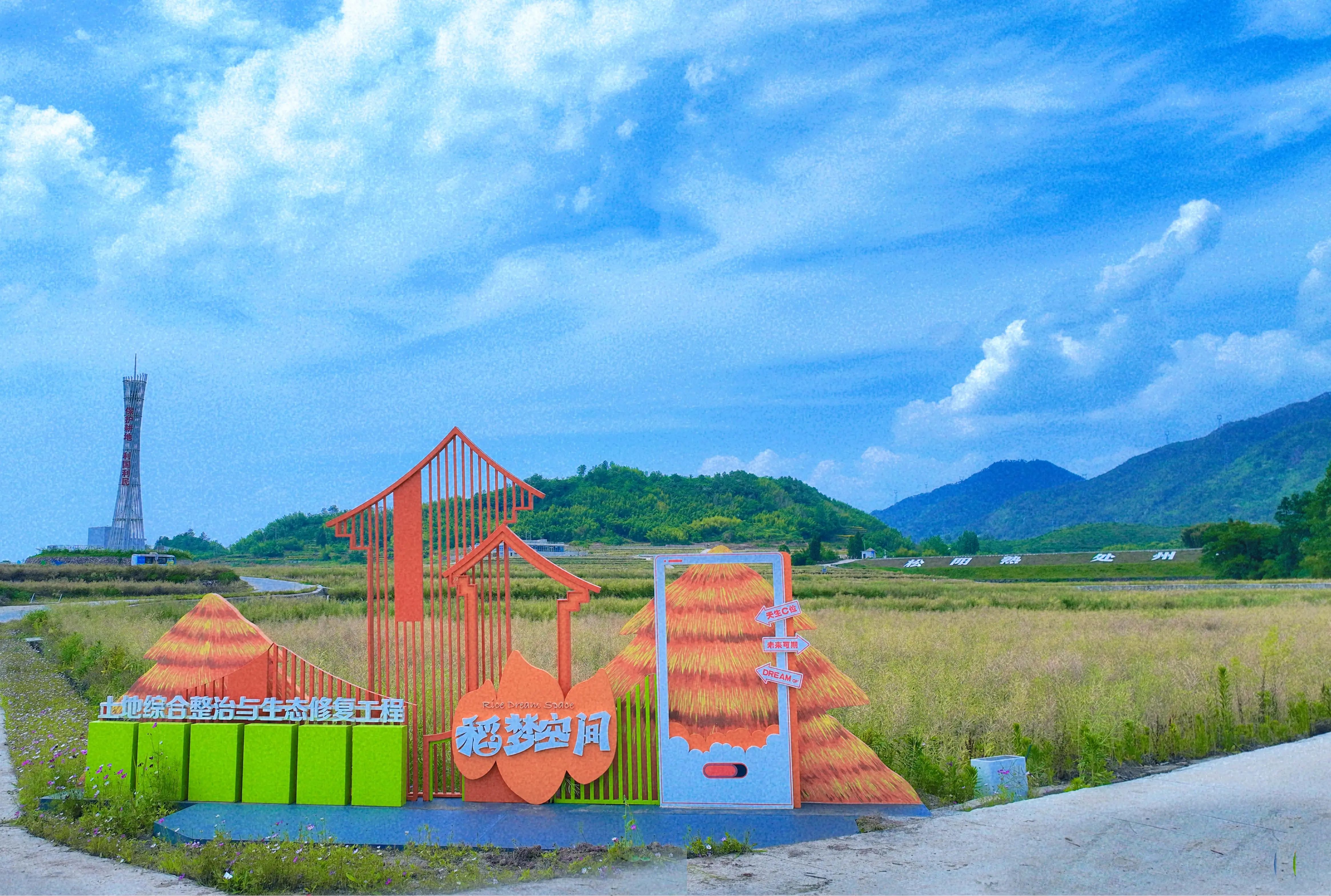 山下阳村作为省内留存较完整、体量最大的古村落之一,质朴的底色与绿水青山密切契合。为刷新古村“颜值”,一地文化组建专业团队,开展现场踏勘、实地调研,融合古村风貌与党建元素,将现有的广场提升改造为稻香主题文化广场,成为村民休闲娱乐场所。依托百亩良田,精心打造具有稻田特色的大地艺术景观,展示“二十四节气”“大米的一生”等农耕文化。同时,通过生态农业监测站和观景平台的展陈,全方位展示松阳县跨乡镇全域土地综合整治硕果。