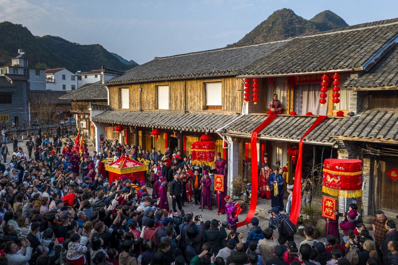 近年来,双峰乡从机制破题,打破以往的“政府花钱赚吆喝”模式,创新推出“强村公司+文化IP”,由大皿、东坑、溪上、溪下、西告5个行政村共同组建皿溪强村有限公司,通过打造“念想双峰·羊家有喜”文化IP,实行市场化统一运营,将分散的文旅资源转化为集体经济增收的“聚宝盆”,打造“周周有戏、村村参与、户户收益”乡村文旅新节奏。这种创新模式,为各村带来文旅分红,真正实现“强村带弱村、抱团谋发展”。 “羊家有喜”活动不仅是一场文化盛宴,更是家门口的“共富集市”。抛绣球招亲活动中,除“新娘”“状元”角色从游客中随机产生外,其余30多名“演职人员”均为当地村民,不仅为他们提供了稳定的就业岗位,还带动了周边农家乐、民宿发展。非遗炼火表演专门安排低收入农户制作炼火用碳,72岁的低收入农户羊大伯高兴得合不拢嘴,“现在我在家里轻轻松松烧炭就能赚钱,每月大约能赚1000元。”