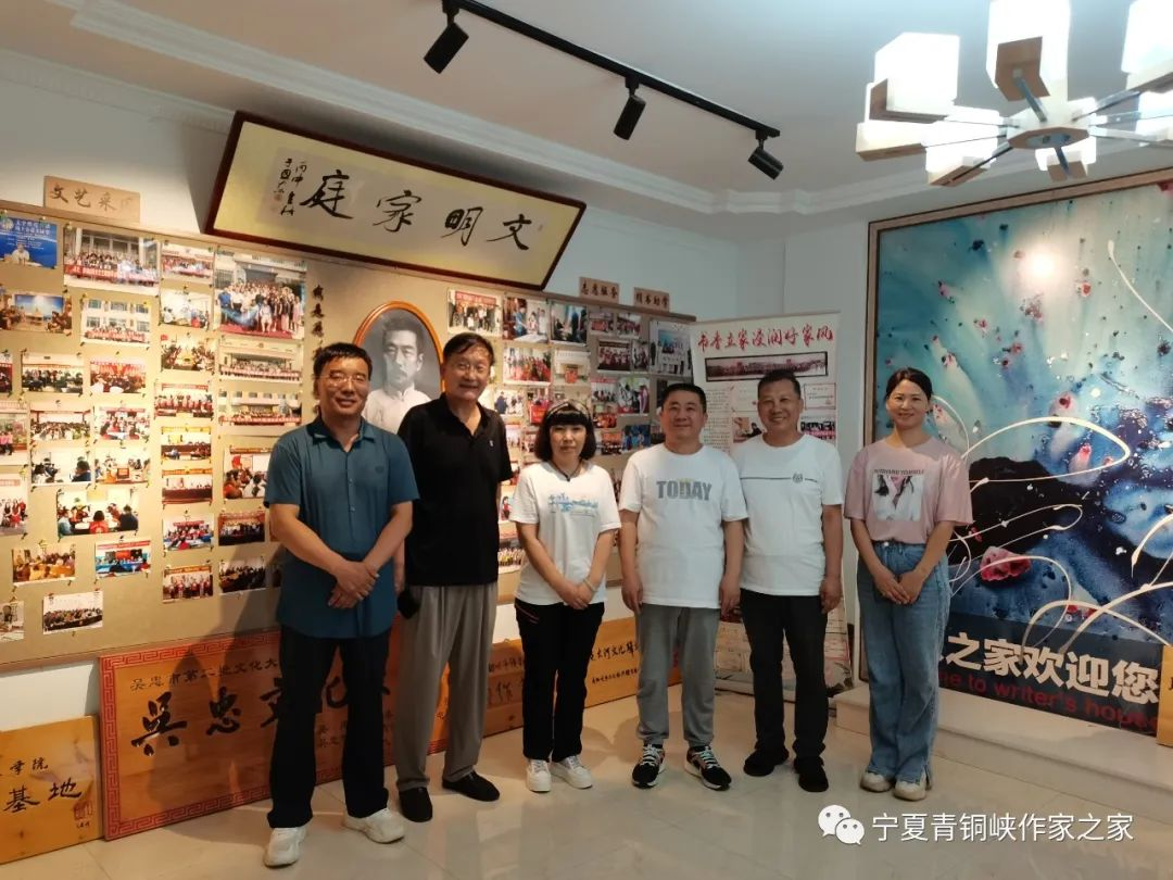 6月8日,中国文联权益保护部主任鲍淑艳(前排左一)一行莅临作家之家调研并召开座谈会。吴忠市文联主席马娟(前右一),青铜峡市市委常委、宣传部部长徐怀俊(后排左一),青铜峡市陈袁滩镇党委书记武智杰(后排右一)等陪同。