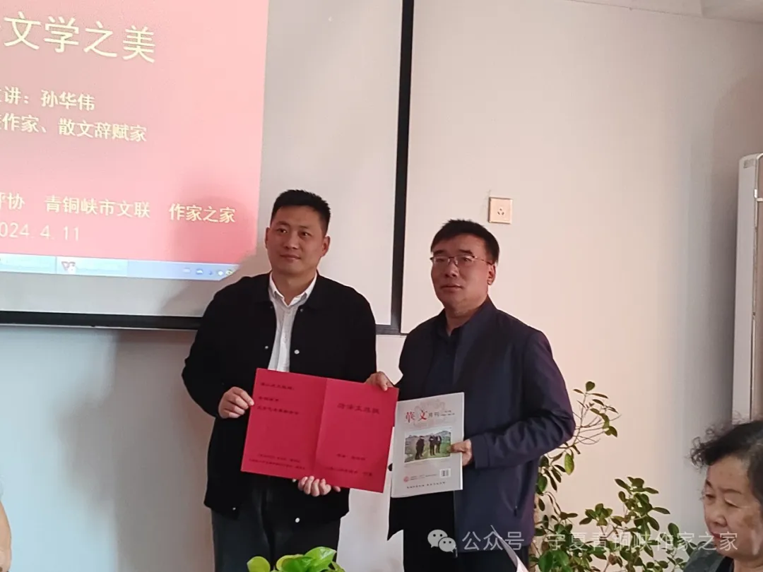 讲座结束后,孙华伟先生先后向青铜峡作家之家、青铜峡市文联、吴忠市作家协会赠送西夏文书法作品、《华文月刊》杂志及其创作的《“作家之家”闻思录》《菏泽文旅赋》《对饮青铜峡》纸质作品。随后,吴忠市作协主席包作军向孙华伟先生赠送志愿者证书,对其不计报酬,热心为吴忠地区文学爱好者授课表示衷心的感谢和敬意。