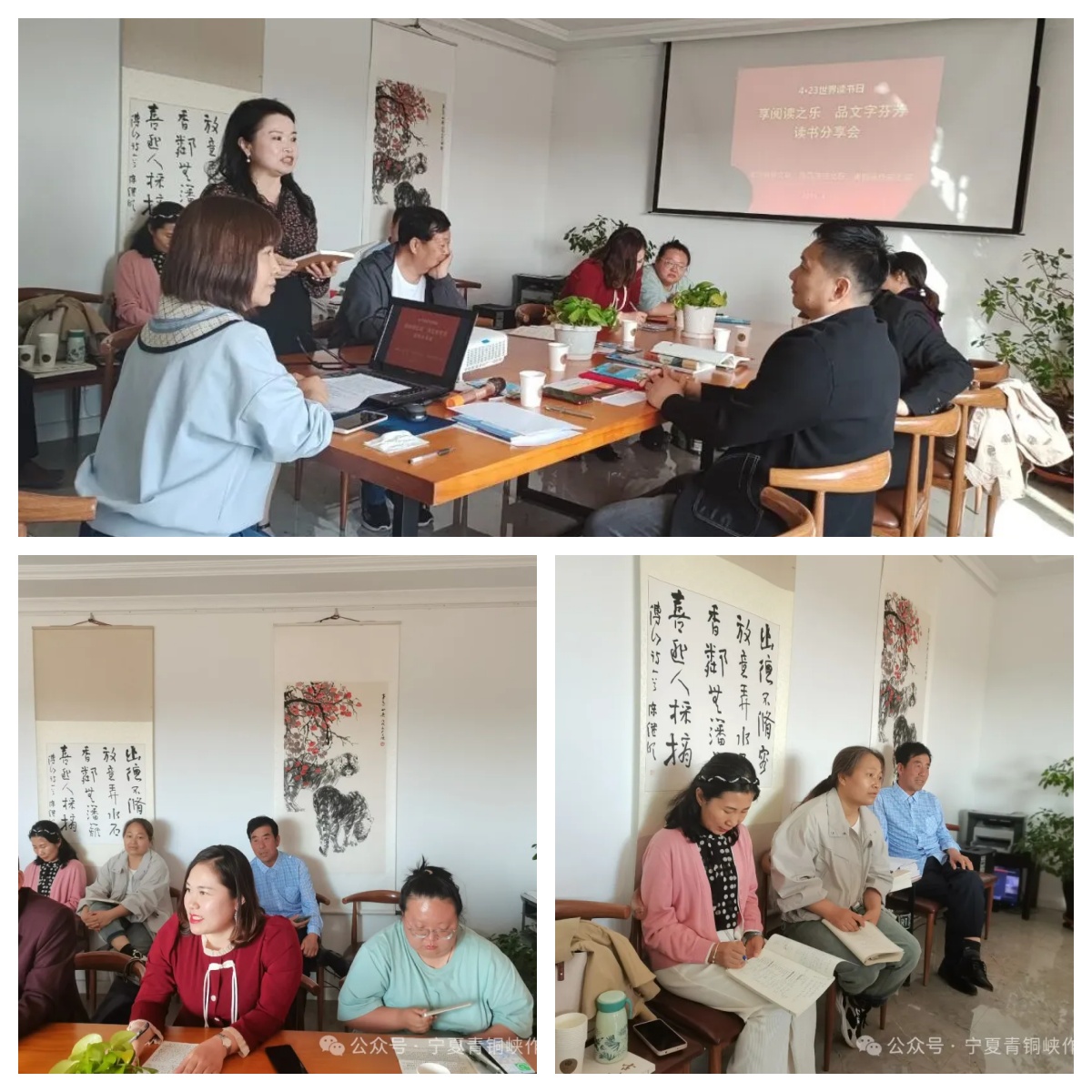 当天,由青铜峡市文联,青铜峡市陈袁滩镇文联,青铜峡作家之家联合举办的“享阅读之乐·品文字芬芳”读书分享会在作家之家举办。来自青铜峡周边县市的部分作家及文学爱好者近30人参加。分享会上,宁夏作协会员、吴忠市评论家协会副秘书长张淑媛,青铜峡作家之家第一、二期“青年作家读书创作”公益培训班学员于海者、龙郁莹等结合自己的创作感悟,踊跃向大家分享了著名作家冯骥才的《俗世奇人》,葡萄牙作家若泽·萨拉马戈的《失明症漫记》,美国作家丹•费金的《汤姻斯河一个美国癌症村的故事》等书籍,让与会人员收获颇多。