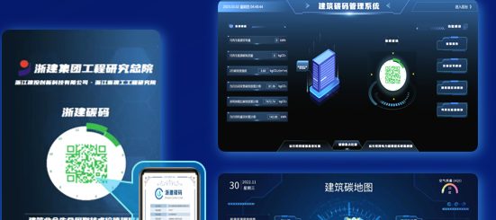 从左往右依次:建筑碳信息一码通系统、浙建·未来建造绿色低碳创新产业园、污水深度脱氮关键技术