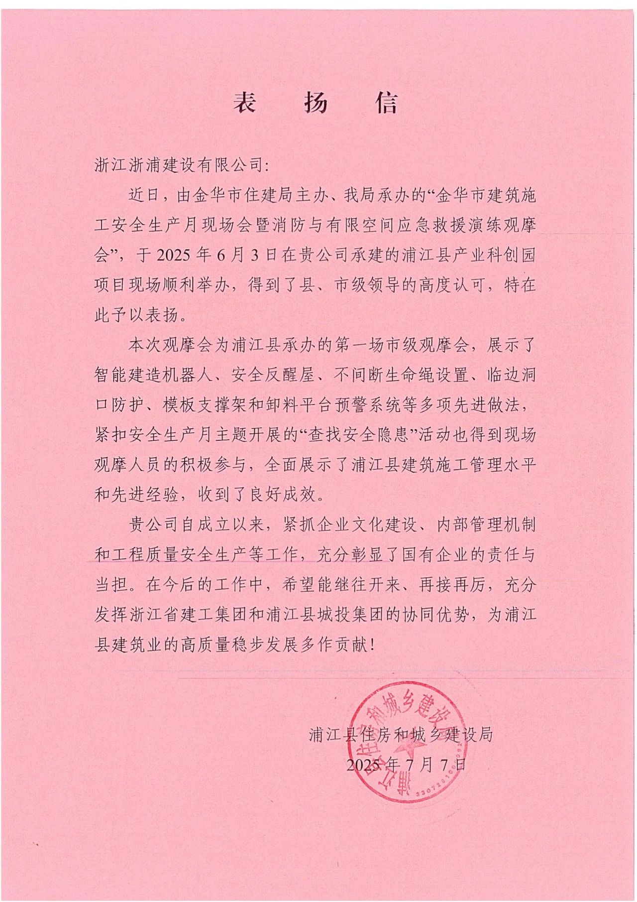浙江建工浙浦建设公司收到浦江县住房和城乡建设局发来的表扬信,就集团浙浦建设公司高质量举办的2025年金华市建筑施工安全生产月现场会暨消防与有限空间应急救援演练观摩会给予高度认可和表扬。