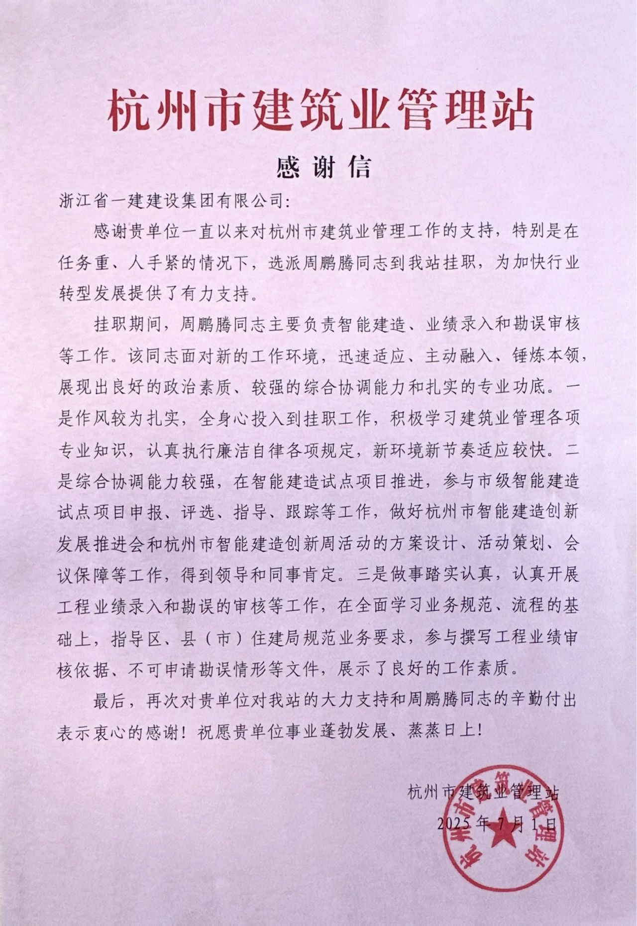浙江一建收到来自杭州市建筑业管理站发来的感谢信。信中对浙江一建支持杭州市建筑业管理工作表示感谢,特别是在任务重、人手紧的情况下,选派人员到市建管站挂职,为加快行业转型发展提供了有力支撑。