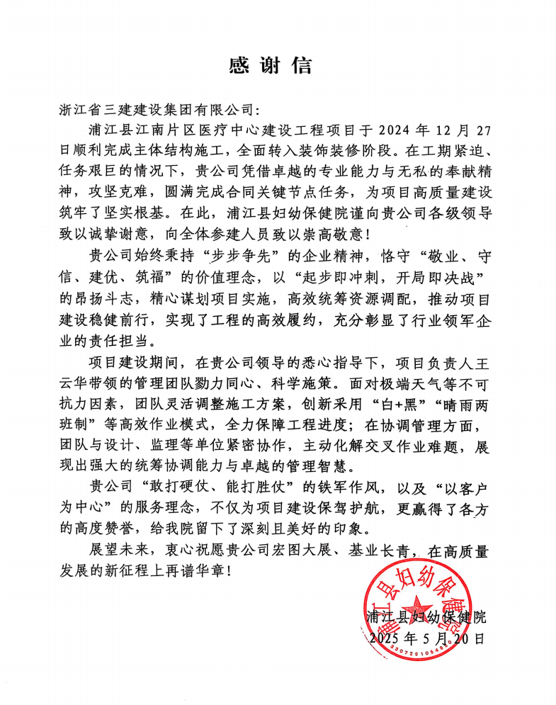 浙江三建收到浦江县妇幼保健院发来的感谢信。信中提到,在工期紧迫、任务艰巨的情况下,项目部凭借卓越的专业能力与无私的奉献精神,攻坚克难,圆满完成合同关键节点任务,为项目高质量建设筑牢了坚实根基。