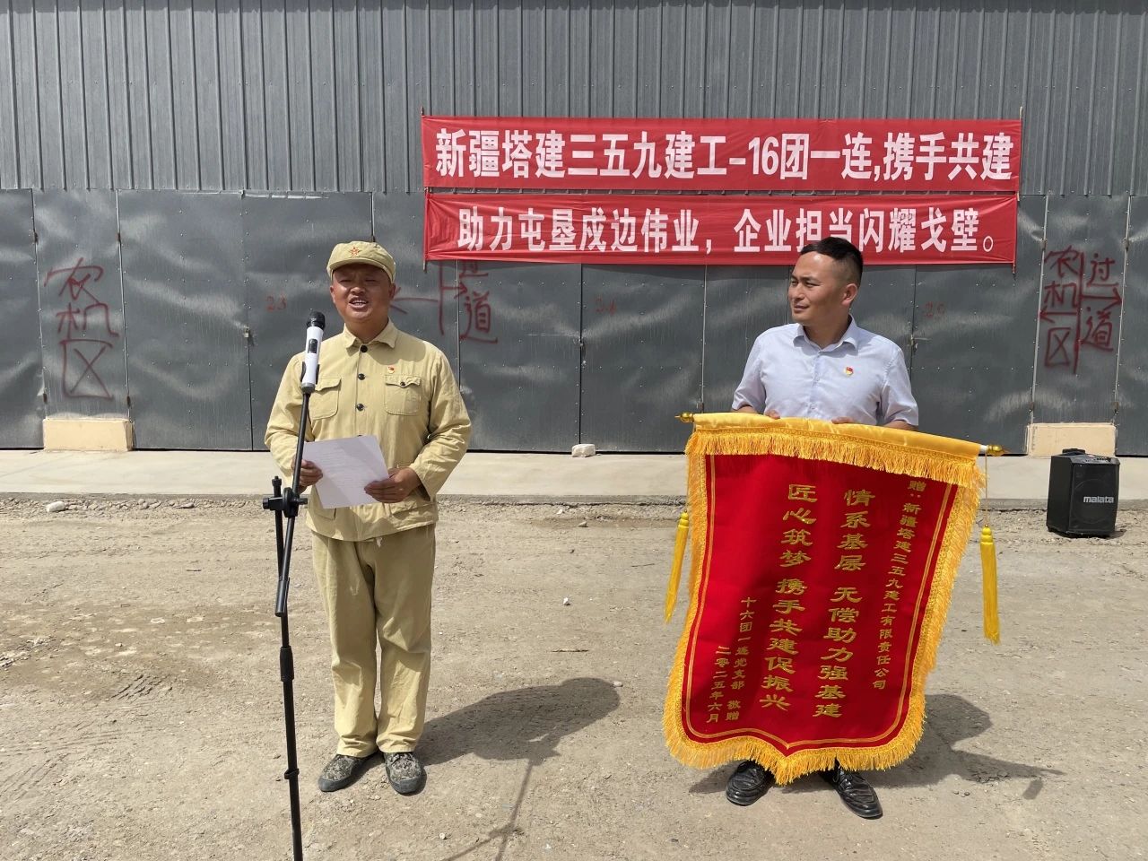 三五九建工第一师G217(博斯坦)-16团公路第一合同段项目部收到驻地第一师十六团一连送来的感谢信和锦旗。信中表示,地坪硬化工程不仅改善了机务库房的作业环境,有效解决了以往地面泥泞、设备停放不便等难题,更体现了三五九建工服务基层、助力乡村振兴的深厚情怀。