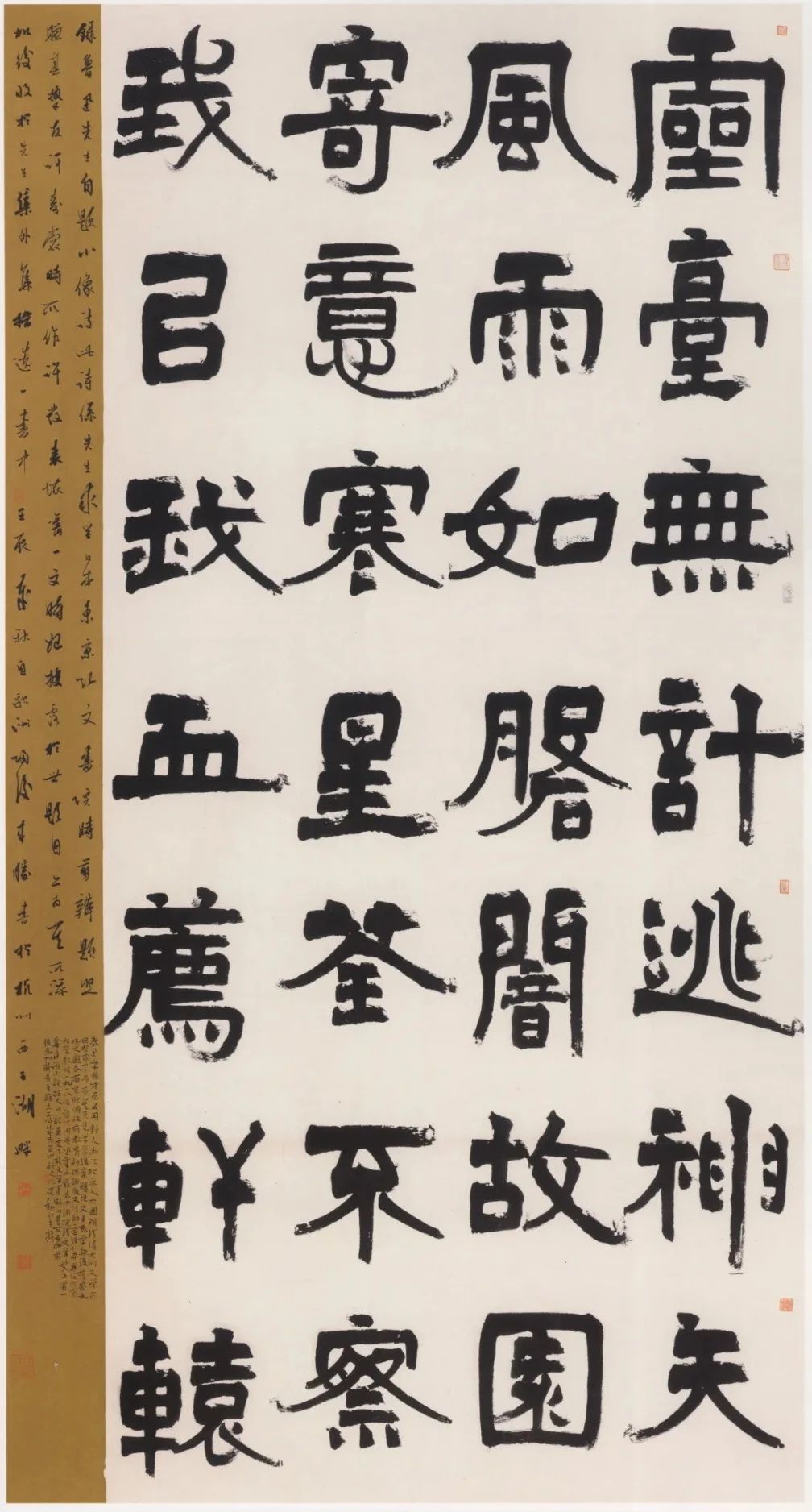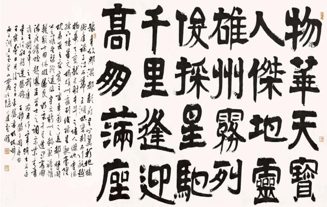 书法之“法”得自名家碑帖,但若一味拘“法”,难以出帖,充其量不过是个书匠。明代书画大师董其昌在《画禅室随笔》中所言极到,“书家未有学古而不变者也,盖书家妙在能合,神在能离”。来胜在临帖过程中不追求形肖,而追求神似。“问渠那得清如许”,来胜将《石门颂》的灵动飞逸、《张迁碑》的质朴矫健和伊秉绶的浑重豁达集于一身,逐步形成自己朴厚雄强、刚健劲挺、拙中含姿、淡中入妙、韵致古雅、笔老意新的书风。