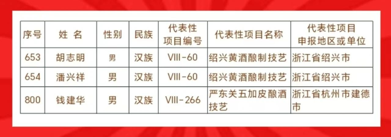 《国企》杂志融媒浙江讯 (党建好故事 江 风)3月17日,文化和旅游部公布第六批国家级非物质文化遗产代表性传承人名单(942人),浙江酒业共有3位传承人成功入选,他们分别是:绍兴黄酒酿制技艺传承人胡志明、潘兴祥,严东关五加皮酿酒技艺传承人钱建华。据悉,中国酒业共有14位传承人成功入选。
