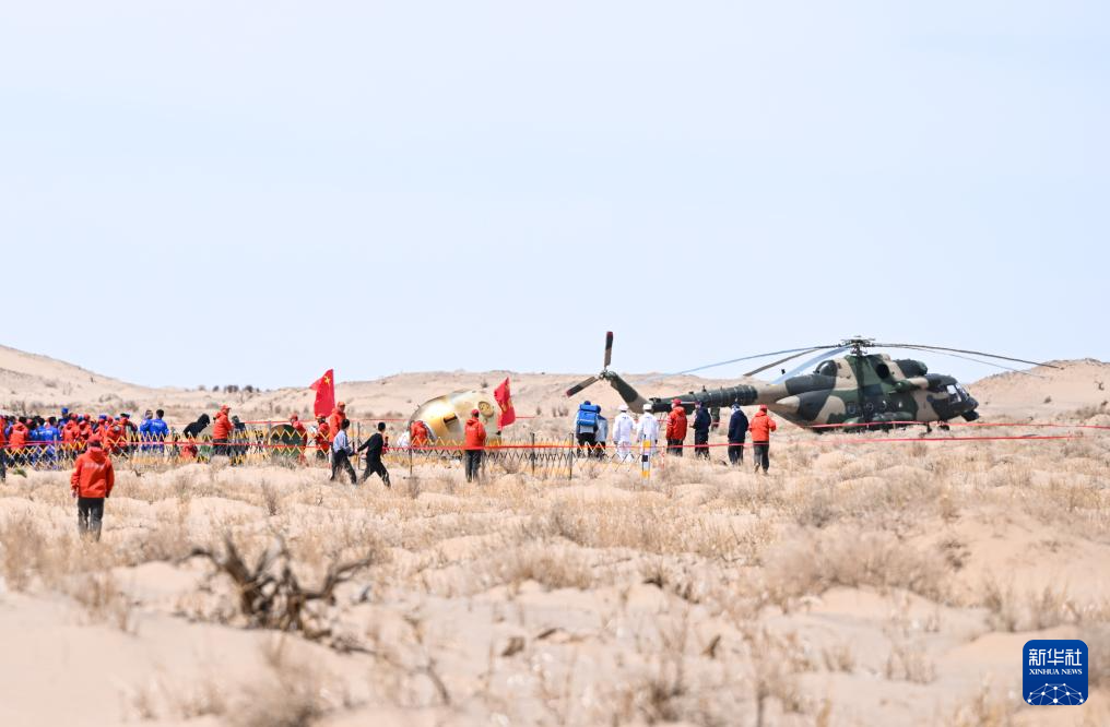 4月30日,神舟十九号载人飞船返回舱在东风着陆场成功着陆,航天员蔡旭哲、宋令东、王浩泽身体状态良好,神舟十九号载人飞行任务取得圆满成功。 新华社记者 马金瑞 摄