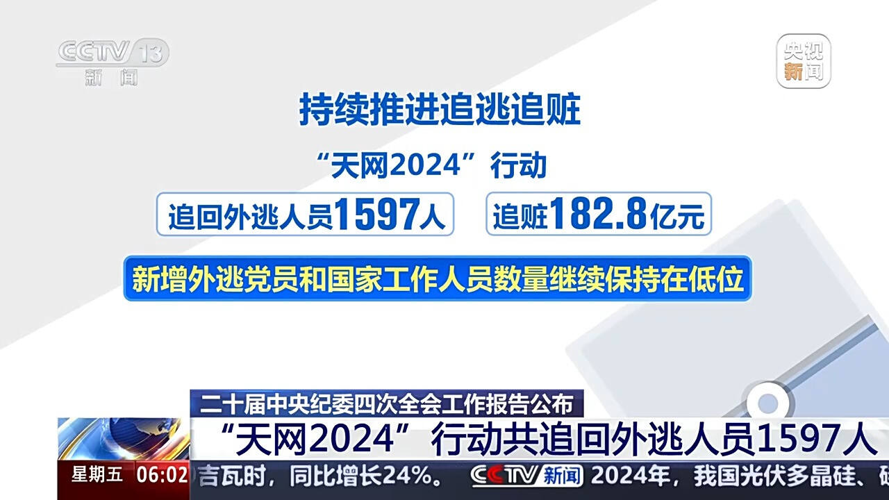 境内打“虎”拍“蝇”,境外猎狐不停,纪检监察机关开展境外腐败问题专项治理,立案查处跨境腐败案件360件,挽回损失322亿元;持续推进追逃追赃,“天网2024”行动共追回外逃人员1597人,追赃182.8亿元,新增外逃党员和国家工作人员数量继续保持在低位。