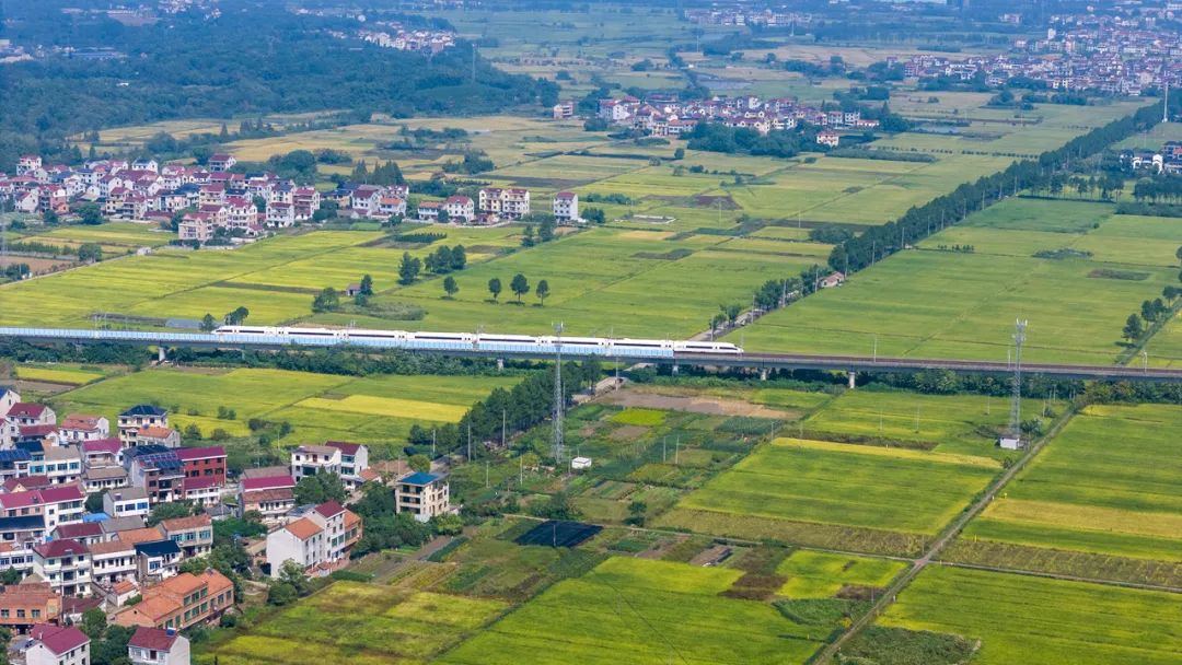 金华婺城,一列高铁列车飞驰在田园间 图源:潮新闻客户端