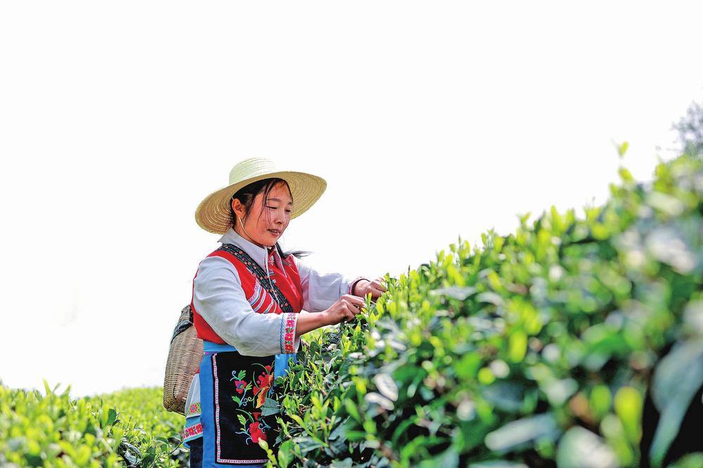 茶农采摘鲜叶。