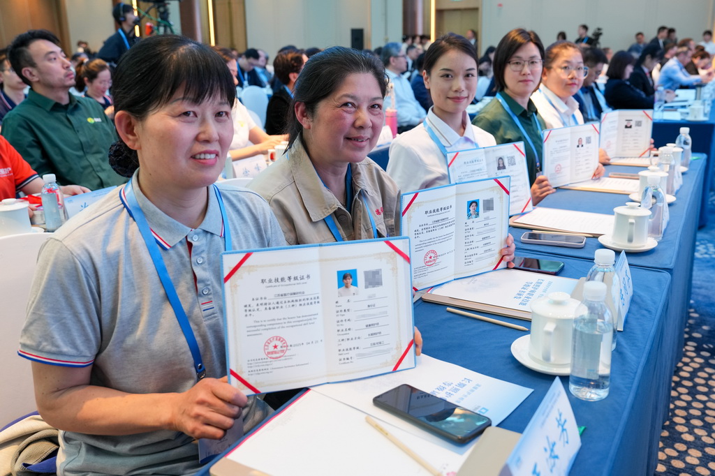 4月28日,长期照护师代表在活动中展示证书。