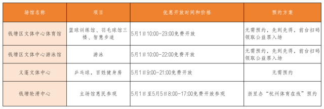 钱塘区文体中心体育馆、义蓬文体中心、钱塘轮滑中心、钱塘区文体中心游泳馆4个体育场馆向大众惠民开放。
