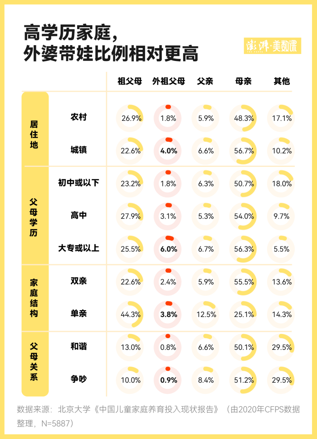 2020年中国家庭追踪调查数据显示,在绝对比例上,无论是在农村还是城镇,还是各类学历家庭中,爷爷奶奶依然是主力。