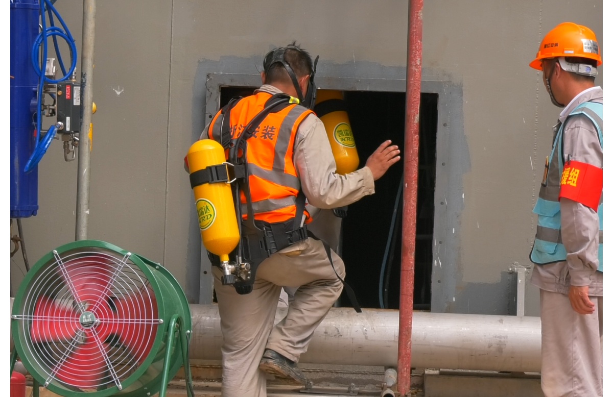 江西深冷气体有限公司空分供气项目救援小组携带空气呼吸器进入冷箱内救援