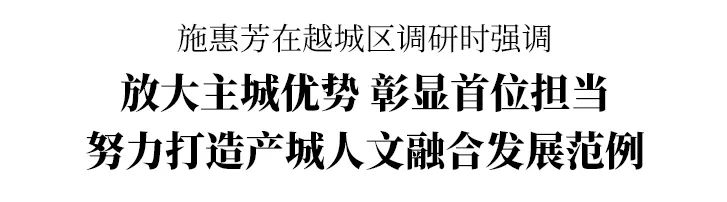 《国企》杂志融媒浙江讯(党建好故事 江 风)7月15日,绍兴市委书记施惠芳赴越城区调研经济社会发展情况。他强调,要深入贯彻习近平总书记“4+1”重要要求和省委“132”总体部署,按照市委加快建设产城人文融合发展的共富示范市决策部署,放大主城优势,彰显首位担当,努力打造产城人文融合发展范例。徐军、马国灿、何坚刚参加。