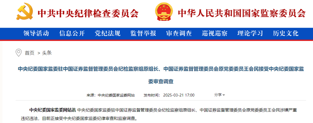 3月21日,据中央纪委国家监委网站消息:中央纪委国家监委驻中国证券监督管理委员会纪检监察组原组长、中国证券监督管理委员会原党委委员王会民涉嫌严重违纪违法,目前正接受中央纪委国家监委纪律审查和监察调查。