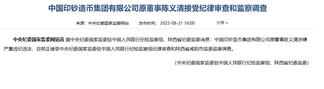 8月21日,中央纪委国家监委网站显示,据中央纪委国家监委驻中国人民银行纪检监察组、陕西省纪委监委消息:中国印钞造币集团有限公司原董事陈义清涉嫌严重违纪违法,目前正接受中央纪委国家监委驻中国人民银行纪检监察组纪律审查和陕西省咸阳市监委监察调查。