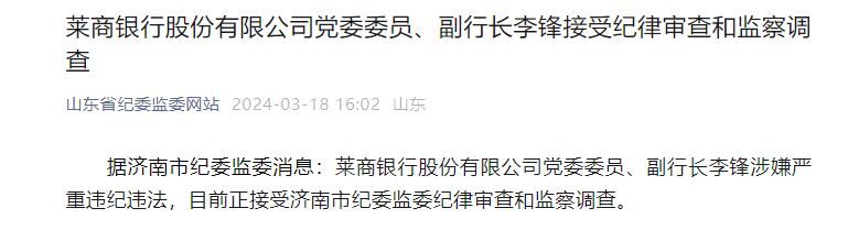 3月19日,山东省纪委监委网站微信公众号显示,据济南市纪委监委消息:莱商银行股份有限公司党委委员、副行长李锋涉嫌严重违纪违法,目前正接受济南市纪委监委纪律审查和监察调查。