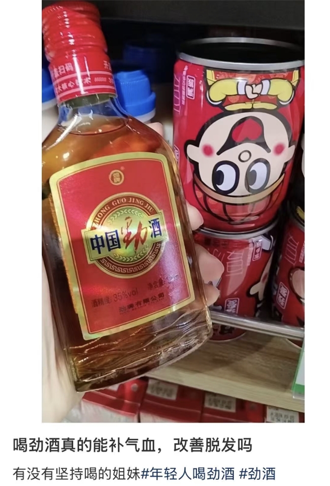 这感觉不像在喝酒,而是在老中医的诊所里把脉抓药。劲酒精准踩中了当代年轻人的养生焦虑,你都不用劝,年轻人一看这配方就默认喝了它能补气血能长头发,端起杯子就一饮而尽。
