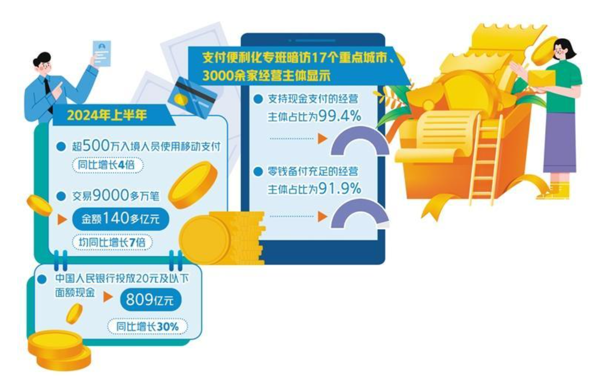 人民银行各分行对全国约9.4万家经营主体进行暗访发现,支持现金支付的经营主体占比为99.3%。支付便利化专班暗访17个重点城市、3000余家经营主体显示,支持现金支付的经营主体占比为99.4%,零钱备付充足的经营主体占比为91.9%,现金收付环境显著优化。