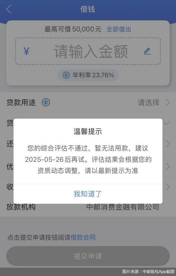 在借款人填写各项信息且已被查看征信的情况下,为何机构已向借款人给出额度,但却在放款时再次拒绝?对此北京商报记者向中邮消费金融采访其中原因,未获得回应。