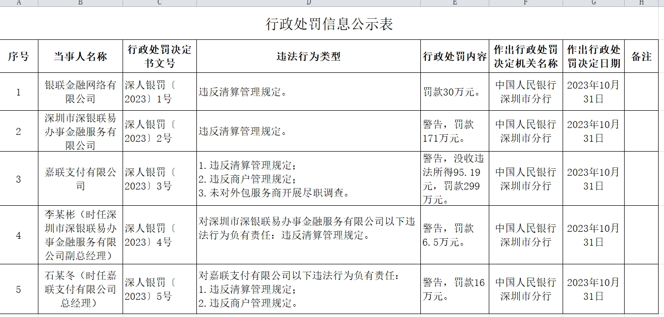 深圳市深银联易办事金融服务有限公司(简称“易办事”),因违反清算管理规定,同样被警告,并处以171万元罚款。相关责任人被处以警告,被罚款6.5万元。