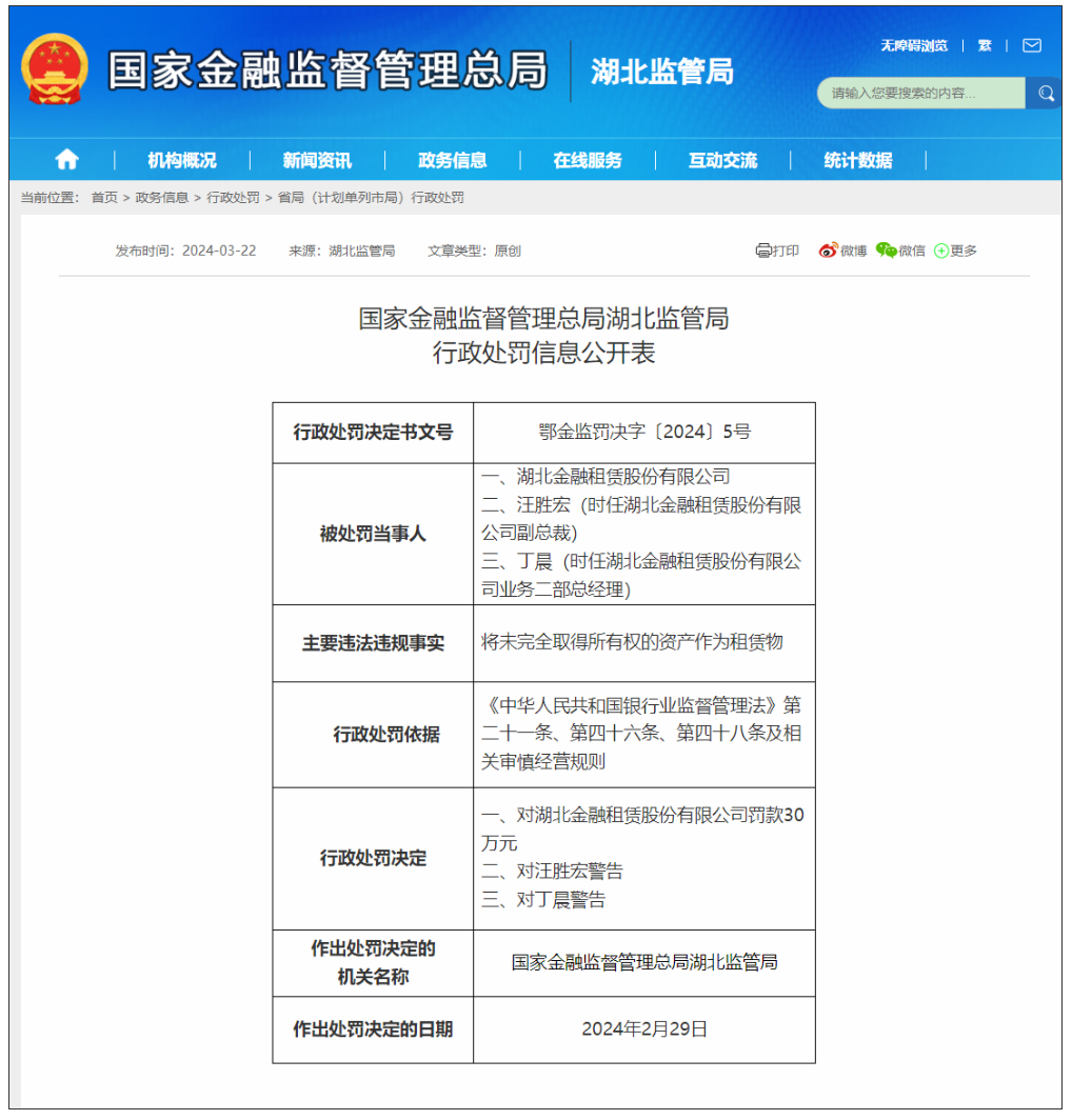 湖北金租因租赁物违规被罚30万元 两名相关责任人被警告