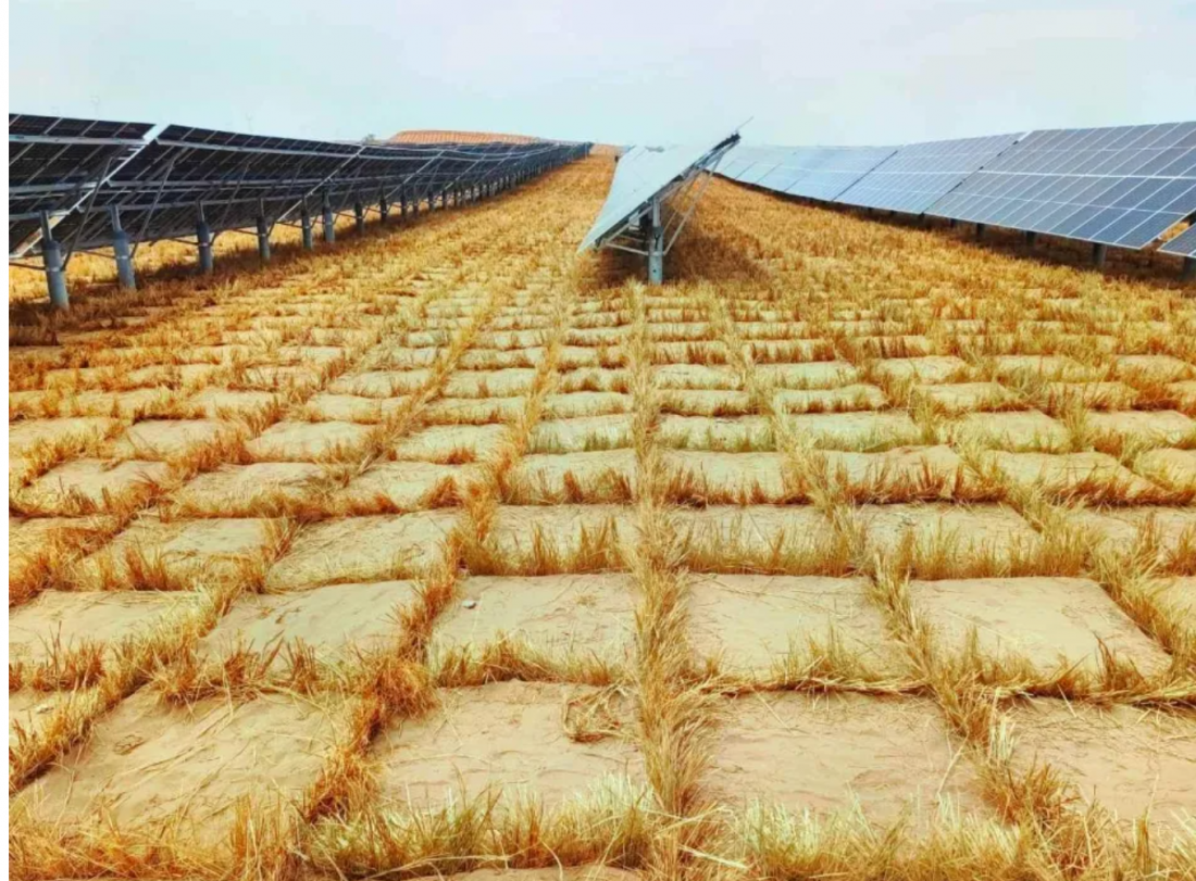 该项目治沙面积达到1200亩,主要采用干草沙障相结合一封到顶的全封式治沙模式,设置网格状双眉式沙障,每一块光伏板下方,都覆盖着若干个草方格,环环相扣,牢牢缚住黄沙。覆盖在地表的干草沙障草方格,可以减缓沙丘的移动,有助于地表的固沙保水,减少沙尘的扬起,有利于光伏组件发电;架设在沙化土地上的光伏板既能吸收太阳辐射的热量又能遮挡太阳强光,减少了地表水分的蒸发,还可以形成避风港,降低风速,减少风沙侵蚀,有效改善植物的生存环境;光伏板形成的集雨面,还能使雨水聚集落到地面,提高光伏板下土壤含水率,加之还可以利用清洗光伏板的废水,促进光伏电场内的植被生长、增加植被覆盖率。