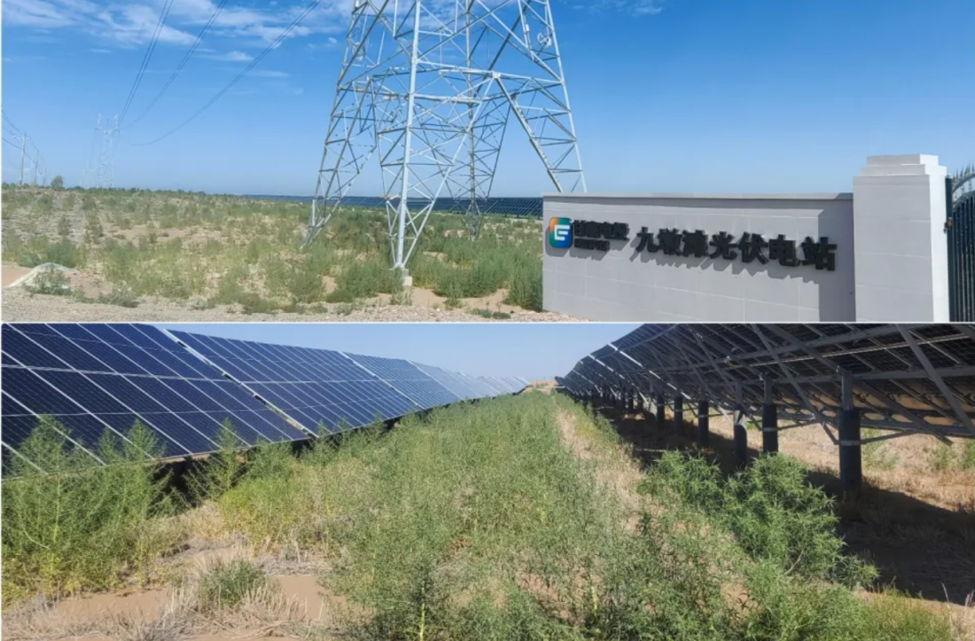 “光伏+治沙”模式是发展新能源产业与沙漠生态治理的有机结合,是推动地方经济发展,助力生态文明建设的有益尝试。自项目建成投运以来,酒汇公司在抓好日常安全生产的基础上,坚持把防风治沙作为关键任务,充分利用发电场区光伏组件风障、沙障、集雨、热力平衡效应等的作用,结合治沙、防沙以及绿化的模式,在项目区光伏板下草方格内播撒黄毛蒿、沙米等草籽,在光伏场区规模化种植梭梭防风固沙林带,以光锁沙、以草固沙。积极开展光伏治沙技术的培训和宣传,进一步提高员工对光伏治沙的认知度和支持度,提高全员环保意识和技能水平。在日常设备巡检过程中加入了对地表植被的巡视和检查,及时发现和处理枯枝败叶和病虫害问题,并根据实际情况合理规划巡检路线,避免人为因素对植物造成踩踏破坏。经过一年来的努力,茫茫沙海已变身成为光伏的蓝海,板下绿意葱茏,与之前形成鲜明对比,实现沙漠地区太阳能资源高效利用和沙漠变绿洲的双重收益。