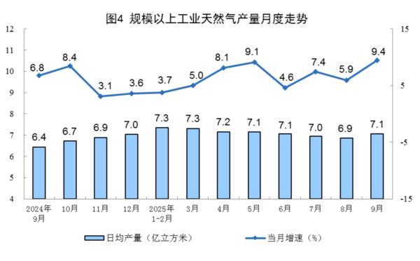 天然气生产增速加快。9月份,规上工业天然气产量212亿立方米,同比增长9.4%,增速比8月份加快3.5个百分点;日均产量7.1亿立方米。