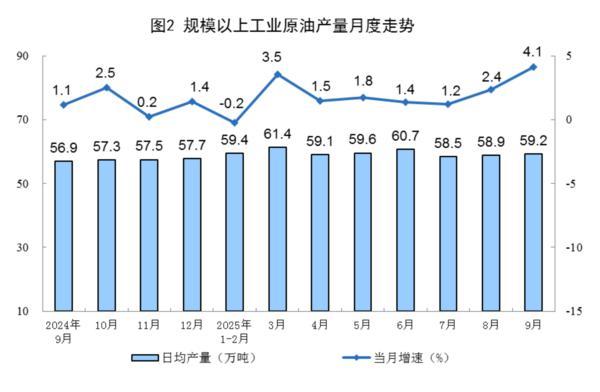 原油生产增速加快。9月份,规上工业原油产量1777万吨,同比增长4.1%,增速比8月份加快1.7个百分点;日均产量59.2万吨。