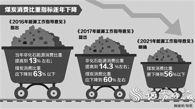 事实上,国家能源局已连续多年在年度能源工作指导意见中明确推动能源消费结构优化。例如,《2016年能源工作指导意见》指出,当年非化石能源消费比重提高到13%左右;煤炭消费比重应下降到63%以下。随后,非化石能源消费比重这一指标逐年提高,煤炭消费比重在历年发布的能源工作指导意见中不断下降。《2017年能源工作指导意见》提出,非化石能源消费比重提高到14.3%左右;煤炭消费比重应下降到60%左右。而今年发布的《2021年能源工作指导意见》明确,煤炭消费比重要下降到56%以下。