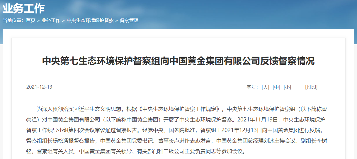督察要求,中国黄金集团要发挥中央企业示范引领作用。要统筹协调生态保护和资源开发,督促各级企业严格遵守生态环境保护法律法规,强化矿山生态保护修复、污染物排放管控、环境风险排查整治。要回应社会关切,切实解决群众反映强烈的突出生态环境问题。对失职失责问题,要进一步深入调查,厘清责任,严肃、精准、有效问责。