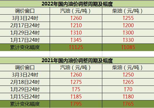 中国网财经梳理发现,此次调价是年内成品油价第四次上涨。目前国内汽、柴油价格累计上调1125元/吨、1085元/吨。据了解,去年同期汽、柴油价格累计上调分别是795元/吨、765元/吨。粗略估计,今年上调涨幅比去年同期高约40%。