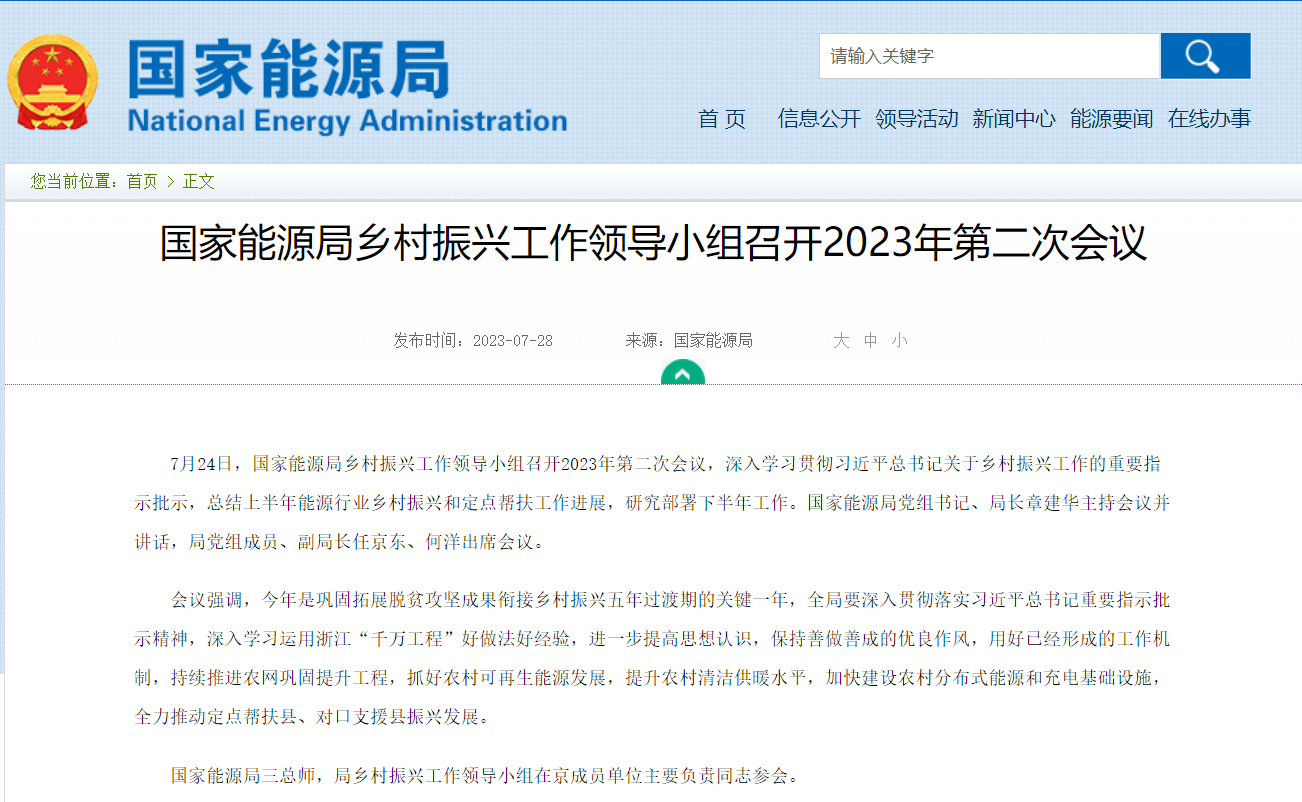 据国家能源局网站消息,7月24日,国家能源局乡村振兴工作领导小组召开2023年第二次会议,总结上半年能源行业乡村振兴和定点帮扶工作进展,研究部署下半年工作。