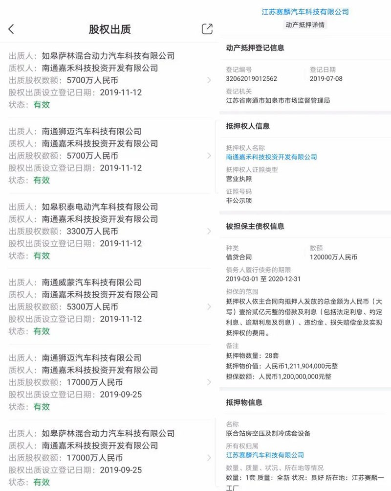 从2019年7月5日至11月12日之间,如皋萨林、南通狮迈、南通威蒙和如皋积泰4家公司先后向同一位质权人——南通嘉禾出质了所持有的部分赛麟汽车股权,合计出质股权数额为20亿元。