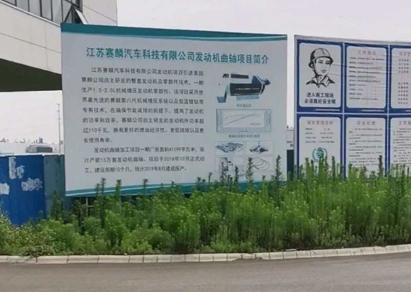 据施工铭牌,此处为赛麟汽车发动机曲轴项目,该项目引起美国赛麟公司自主研发的整套发动机及零部件技术,原计划在2018年10月正式动工,建设周期10个月,于2019年8月建成投产。