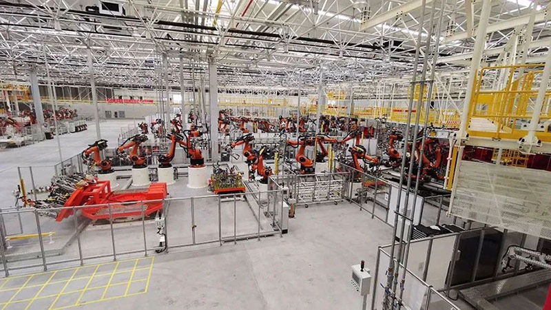 整个流水线采用了高速滚床,车间与车间之间建有连廊;焊装车间内,百余台KUKA(库卡)机械手臂静静矗立的场景蔚为壮观;总装车间内,流水线上布满可升降的电动自行吊具,数台AVG停放一旁。
