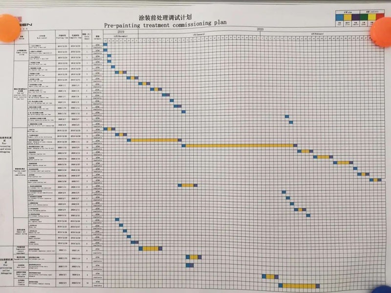 涂装车间现场遗留的一份涂装车间设备问题清单显示,部分问题在2019年11月得到解决并形成闭环。同时,调试计划表上,电泳、前处理的调试计划从2019年12月23日开始,于2020年2月29日完成。