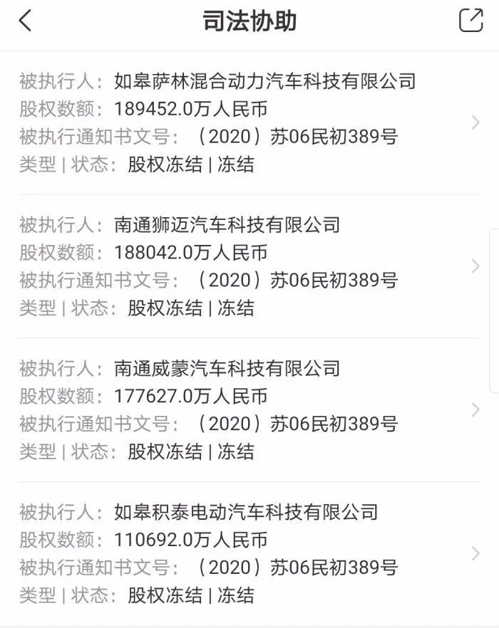 天眼查显示,除查封固定资产外,南通中院在6月17日冻结了如皋萨林、南通狮迈、南通威蒙和如皋积泰所持赛麟汽车的股权,数额分别为18.95亿元、18.8亿元、17.76亿元和11.07亿元。