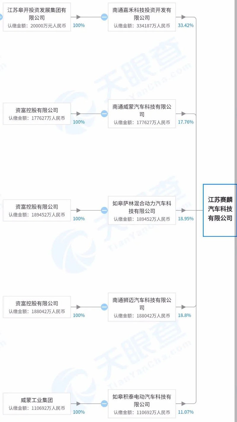 天眼查显示,赛麟汽车股东分别为南通嘉禾、如皋萨林混合动力汽车科技有限公司(下称“如皋萨林”)、南通狮迈汽车科技有限公司(下称“南通狮迈”)、南通威蒙汽车科技有限公司(下称“南通威蒙”)、如皋积泰电动汽车科技有限公司(下称“如皋积泰”),对应的持股比例为33.42%、18.95%、18.8%、17.76%、11.07%。其中,南通嘉禾为如皋市政府100%持股的江苏皋开投资发展集团有限公司的全资子公司,其余4家被视为王晓麟“实际控制”的外资股东。