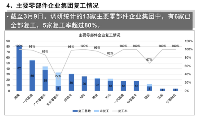 零部件企业层面,截至3月9日,调研统计的13家主要零部件企业集团中,有6家已全部复工,5家复工率超过80%。