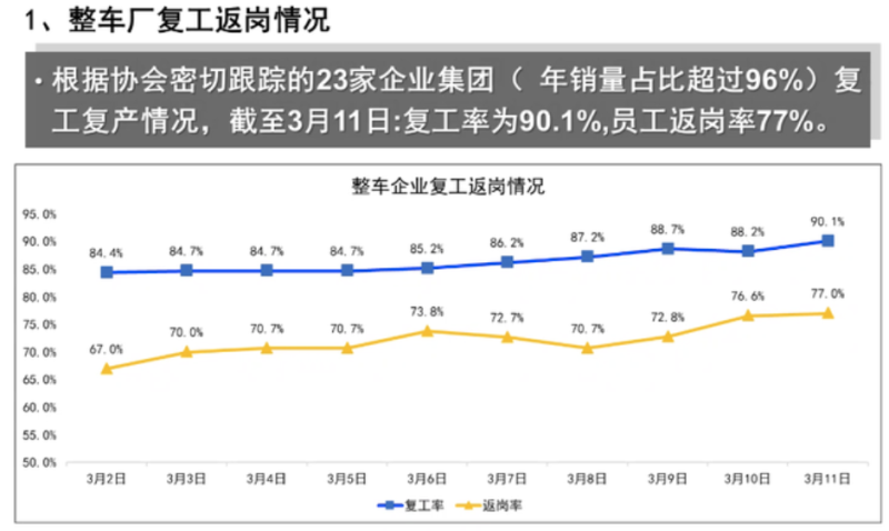 蓝鲸汽车3月12日讯,今日,中汽协公布最新汽车行业复工数据,截至3月11日,调研统计的23家整车企业中(年销量占比超96%)复工率达90.1%,整体复产率超40%,员工返岗率为77%。