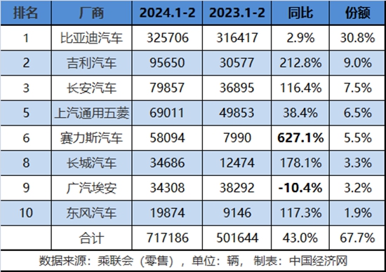 受春节假期因素影响,以及对以旧换新等政策的消费期待,2月新能源车市出现了罕见的同环比下滑,但综合1-2月来看,仍延续良好表现。在乘联会发布的新能源汽车厂商零售销量TOP10之中,传统品牌也与大盘保持一致。