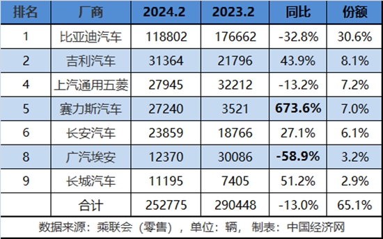 在乘联会发布的新能源汽车厂商零售销量TOP10之中,传统品牌也与大盘保持一致,2月入榜的7家传统新能源合计销量25.3万辆,同比下滑13%;前2月,传统新能源入榜8家品牌,合计销量71.7万辆,同比增长43%。2月及前2月,传统新能源依然保持着近七成的市场份额。