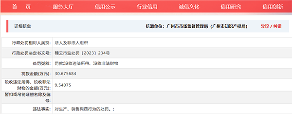 中国网财经3月15日讯(记者 顾凡)日前,信用广州发布的一则行政处罚信息显示,广州粤华制药有限公司因生产假药加味霍香正气丸,被罚没40余万元。