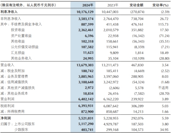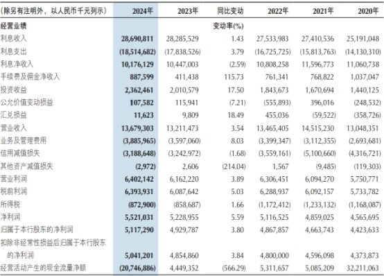 2024年,重庆银行利息净收入为101.76亿元,较上年减少2.71亿元,降幅2.59%;手续费及佣金净收入为8.88亿元,较上年增加4.76亿元,增幅115.73%;公允价值变动损益及投资收益24.70亿元,较上年增加3.44亿元,增幅16.15%;业务及管理费为38.86亿元,较上年增加2.89亿元,增幅8.03%;信用减值损失为31.89亿元,较上年下降0.54亿元,降幅1.68%。