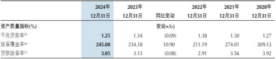 截至2024年12月31日,重庆银行不良贷款余额为54.63亿元,较上年末上升2.51亿元;不良贷款率为1.25%,较上年末下降0.09个百分点;拨备覆盖率245.08%,较上年末上升10.90个百分点。